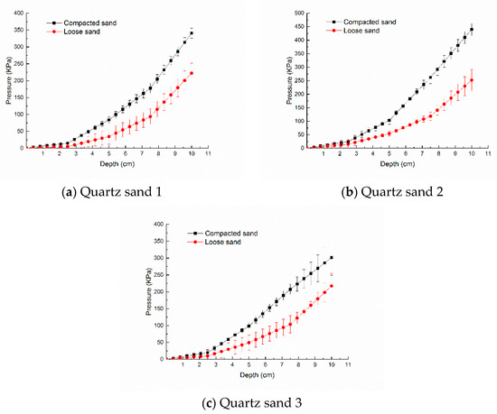 The looseness and compactness degrees of quartz sand were characterized (Figure 10). Obviously, the cone index (intrusion pressure) of the compacted quartz sand was larger than that of the loose quartz sand.