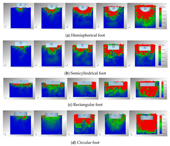 During the entire intrusion process, the speed of the foot was set uniformly at the same intrusion speed as in the test (120 mm/min), and the motion time was 5 seconds. Since the number of particles seriously affects the operational speed of the computer, we selected 1/4 of the original size of each mechanical foot. In addition, this study focused on the dynamic mesoscopic mechanical behaviors of sand particles, such as the velocity fields, the contact force fields and the particle disturbance ranges. The size of the mechanical feet had little effect on the analyses of the simulation results [35].