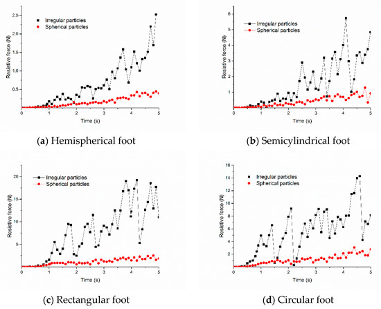 The effect of particle shape on the foot intrusion resistive force is shown in Figure 13. The resistive force of intrusion into the irregular particles was greater compared with the regular spherical particles for all these four mechanical feet. This also confirms our hypothesis that irregular particles produce a greater intrusion resistive force against the mechanical feet than regular spherical particles. The main reason is that the shapes of irregular particles are more variable, which facilitates packing and increases inner friction.
