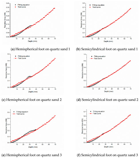 To evaluate and check the difference between the modified mechanical model and the test curve, we compared the intrusion resistive forces of mechanical feet with variable cross-sectional areas intruding into three kinds of quartz sand, respectively (Figure 14). For both the hemispherical foot and the semicylindrical foot, the difference between the modified mechanical model curve and the test curve was always small before the depth was 35 mm, which means it can even be ignored. Therefore, it can be considered that the modified mechanical model can be used to evaluate the intrusion resistive force of a mechanical foot with a variable cross-sectional area.