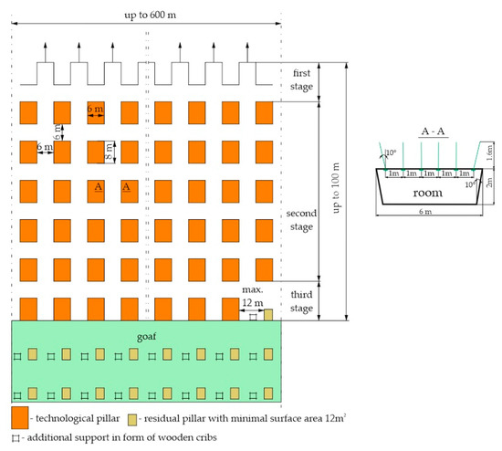 - Skrzypkowski, K. The influence of room and pillar method geometry on the deposit utilization rate and rock bolt load. Energies 2019, 12, 4770. [Google Scholar] [CrossRef]