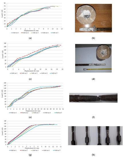- Thenevin, I.; Blanco-Martín, L.; Hadj-Hassen, F.; Schleifer, J.; Lubosik, Z.; Wrana, A. Laboratory pull out tests on fully grouted rock bolts and cable bolts: Results and lessons learned. J. Rock Mech. Geotech. Eng. 2017, 9, 843–855. [Google Scholar] [CrossRef]
