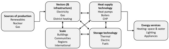 The general principle of system architecture is the description of a system as a set of relationships between its component parts that capture the system’s form and function. The discipline of system architecture emerged from the Apollo Programme in the United States [18]. Drawing on these principles and practical experience, we define energy system architecture as the spatial, topological, and functional organisation of energy generation, conversion, transmission, distribution, and storage systems within the whole energy system. To consider the decarbonisation of heat in the existing UK energy system, we have developed a schematic representation of the system architecture with its different component parts (Figure 1).