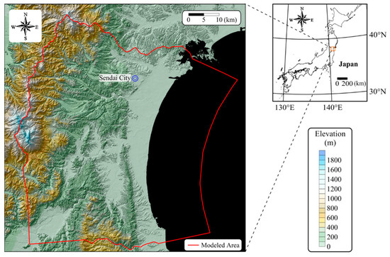 Study area and modeled area quoted from Kaneko et al. [21]. The relief map and elevation data are drawn using the 10 m grid digital elevation map sourced from the Geospatial Information Authority of Japan (GSI).