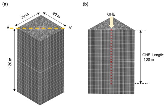 Ground heat exchanger (GHE) model. (a) Bird’s-eye view (b) cross-sectional view at A–A’.