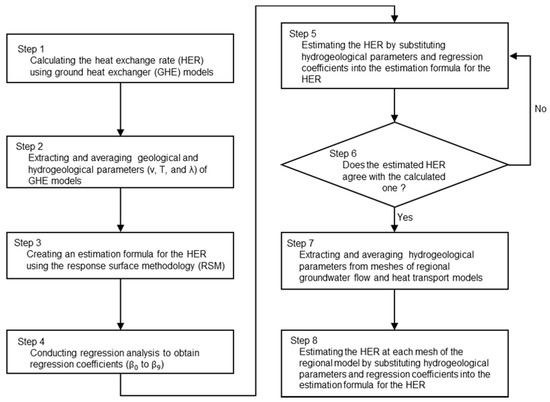 Figure 4 shows a flowchart of the proposed method in this paper. In this study, the hydrogeological condition input to the GHE model and the simulation result of the model were extracted, and the factors affecting HER were statistically analyzed. In the GHE model, hydrogeological parameters include horizontal/vertical hydraulic conductivity, specific storage, thermal conductivity of solid and fluid, volumetric heat capacity, and porosity. The simulation results also include hydraulic heat, subsurface temperature, and groundwater flow velocity. These parameters were average values from the surface to 100 m depth in the analysis because the length of the GHE was set to 100 m. As a result, the HER was correlated with groundwater flow velocity, , subsurface temperature, , and, thermal conductivity of the solid, . It was judged that the HER can be expressed as the function which uses the above three variables. The response surface methodology (RSM) was utilized as a mathematical optimization method, which was used to approximate the HER by Tomigashi et al. [23], consisting of the above three variables in this study. When a quadratic polynomial is used as the response function, the response surface is expressed by the following equation: