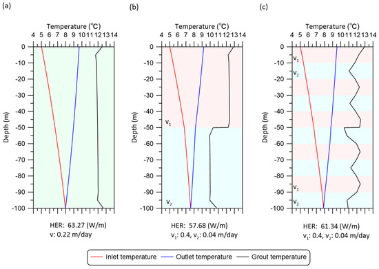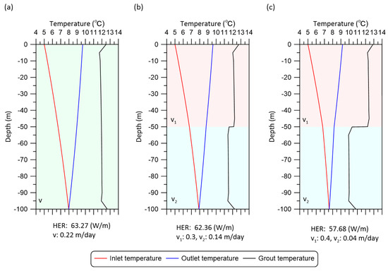 Temperature distribution in the borehole and result of GHE simulation. Groundwater flow velocity was set as (a) : 0.22 m/day, (b) : 0.3 m/day and : 0.14 m/day, and (c) : 0.4 m/day and : 0.04 m/day.
