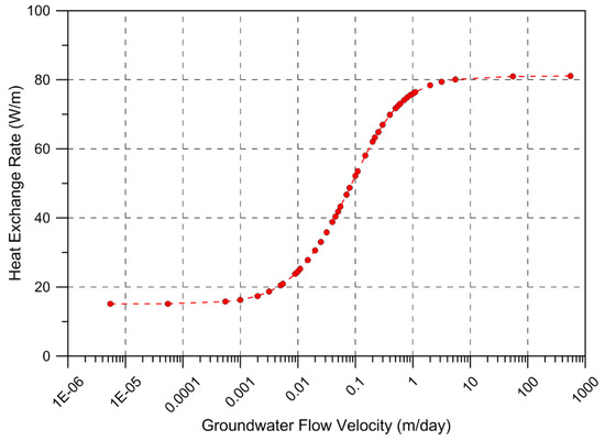 Relationship between groundwater flow velocity and heat exchange rate in the uniform model.