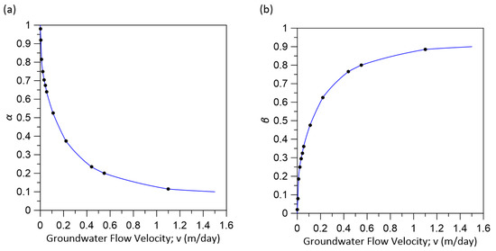 where is the arithmetic average groundwater flow velocity; is the harmonic average groundwater flow velocity; and and are parameters that vary with . The relationship between and the parameters and in Table 2 was interpolated with a cubic spline (Figure 7). The average groundwater flow velocity of the two-layer model can be explained by an arithmetic average because the velocity is smaller; however, it is more affected by the harmonic mean when the velocity is greater.