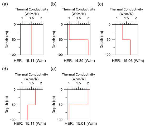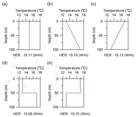 The average values of were examined. Subsurface temperature is affected not only by heat dispersion but also by the advection of groundwater flow [25,26,27,28,29,30,31]. Subsurface temperatures in the geothermal zone, which occurs at depths between 10 and 20 m, normally follow the geothermal gradient which in turn is usually represented by an increase of 1 °C per 20 to 40 m [26,32,33]. Previous studies have noted temperature anomalies at certain depths due to the artificial pumping of groundwater and temperature inversions due to global warming [33]. This study considered the five subsurface temperature profile patterns shown in Figure 8 and investigated the effect that these patterns had on the HER. The arithmetic average value of all these profiles was 15 °C. was 1e-6 m/day and was 1.5 W/(mK). It was found that the HER did not change significantly in any profiles. Therefore, can be calculated as an arithmetic average.