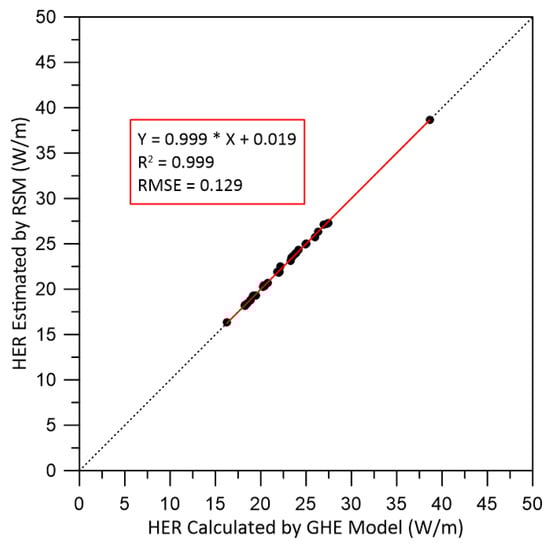 An estimation formula for the HER was created using the HER calculated for 33 GHE models by Kaneko et al. [21], and the three parameters , , and input to the GHE model in Sendai Plain. These parameters are average values calculated by the method shown in Section 3.2. In this study, the regression coefficients to were determined by the least squares method to create an approximate expression using Equation (2). Table 3 shows the parameters of the estimation formula, and Table 4 also shows relational data between the three parameters and HER at 33 GHE models. The HER was estimated by substituting the three parameters and regression coefficients into Equation (2). Figure 10 shows a comparison of the HER calculated by the GHE models, with one estimated by the biquadratic polynomial of the RSM (Equation (2)). The coefficient of determination between the HER calculated by the GHE models and those estimated by the RSM in the Sendai Plain was 0.999, and the root mean square error (RMSE) between these two was 0.129. It was judged that the HER estimated by the RSM was reasonable.