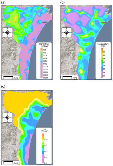 Figure 11 shows a comparison of the distribution map of HERs by Kaneko et al. [21] (Figure 11a, conventional map) with that estimated by the RSM (Figure 11b, refined map) in the Sendai Plain. Figure 12 also shows distribution maps of average groundwater flow velocity (Figure 12a), subsurface temperature (Figure 12b), and thermal conductivity of solids (Figure 12c) from the surface (0 m) to 100 m depth for the plain. There is little difference in the HER between the two maps at the GHE locations; however, the tendency of distribution of the HER between GHE locations was different. This is because the conventional map was created by spatial interpolation based on the HER calculated by 33 GHE locations, whereas the refined map reflects the distribution of the three parameters of , , and . It was found that the area where or was greater had a greater HER in the refined map. It was reported that the HER was strongly related to and for the plain by Kaneko et al. [21].