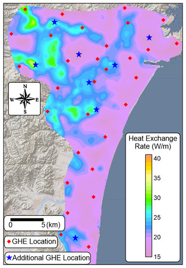 By response surface methodology, which is one kind of optimization method and a surrogate model, the HER can be estimated without heat exchange simulation by GHE model calculation (Figure 10). This proposed method can highly increase the spatial resolution of the HER map as compared to the conventional map (Figure 11). In previous studies, increasing the number of pilot points increased the time needed to create the map. However, the proposed method cannot only estimate the HER from hydrogeological parameters in an easy way but also increase the spatial resolution of the map without performing heat exchange simulations by creating a GHE model. By using this method, it is proposed that the HER can be estimated in other regions if the three parameters of , , and can be obtained. By using the proposed method, users will have the benefit of estimating the HER with field survey data without performing numerical simulations in the future.