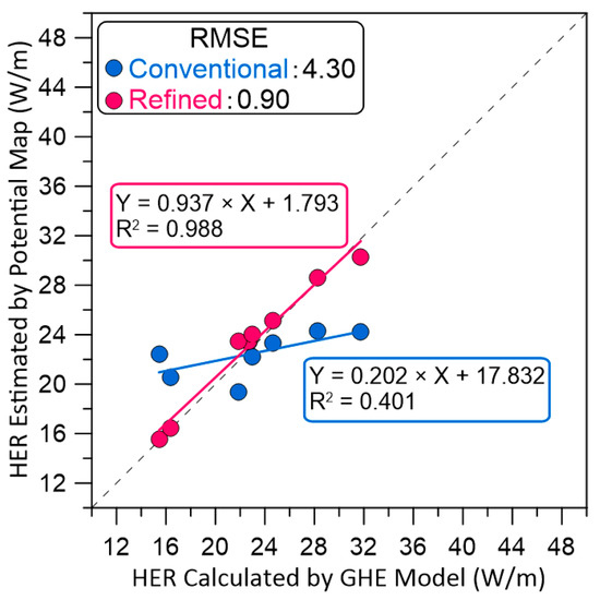 From the above, using the proposed optimization method cannot only estimate the HER from hydrogeological parameters in an easy way but also highly increase the spatial resolution of a map by creating a GHE model without performing heat exchange simulation. The creation of the potential maps in various regions can be expected by using this method and by increasing the relational data between the HER and hydrogeological parameters. To create a universal estimation formula for the HER, it is necessary to consider the averaging method that matches the hydrogeological model of each region, which is a content of further study.