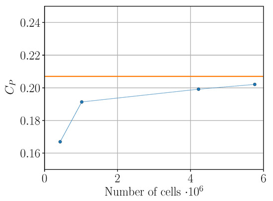 The power coefficient response to a grid size variation for a TSR of . The horizontal orange line represents the experimental value for the tested .