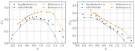 Experimental and numerical values of (left) and (right) as a function of the TSR () for a straight blade turbine (SAVONIUS-H1).