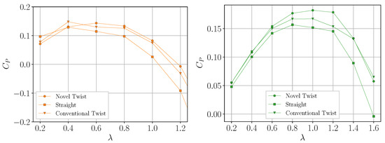 All the studied turbines have the same cross section, and a twist angle of 90° for the twisted blade rotors. The results of the numerical curves are depicted in Figure 8.