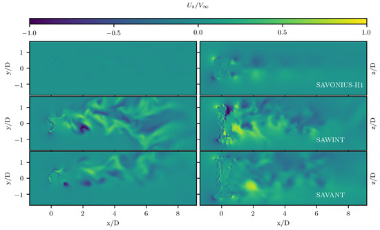Figure 11 reveals the instantaneous normalized streamwise and vertical velocity components, and , respectively, in the horizontal and vertical middle planes for all the studied turbines. This allows for representing and identifying the overall structure of the resulting wake, as well as the influence of the created vorticity on it. The complexity of the resulting flow pattern was found to be asymmetric with the flow direction for all cases. Vortical structures are released from the blade tips and end plates, which are dissipated along the main flow direction. The wake produced by the turbines with twisted blades is characterized by a slower recovery. In addition, for these turbines, a noticiable flow component in the vertical direction (parallel to the rotational axis), , was observed. This means that the incoming flow has been deflected, with SAWINT resulting in the largest change of direction.