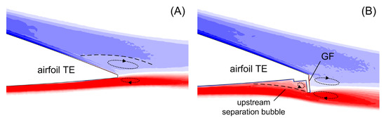 (A) Flow field around smooth airfoil; (B) flow field around an airfoil with a Gurney flap (field data of vorticity from numerical calculation of the authors).