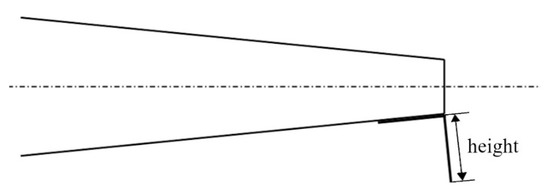Two different types of Gurney flap mounting were investigated (represented in Figure 3). In further detail, the conventional one-side mounting (A) is the most common method, generally including the GF mounted towards the pressure side of the airfoil. In case of functioning onboard a Darrieus turbine, however, each side of the airfoil acts alternatively as the pressure or suction side depending on the fact that the blade is moving in the upwind or downwind half of the trajectory [18]. On this basis, both the configuration with the GF facing out and the one facing in with respect to the revolution centre were tested. In addition to these configurations, the one presented in Figure 3B, called “fish tail” in the following, was also tested. This configuration was thought to somehow reply to the contrasting requests discussed before, i.e., it is able to provide the power augmentation both for positive and negative incidence angles, partially limiting the additional drag coming from the half working in the suction side by inclining it with respect to the chord. In this sense, it can be considered as an evolution of the “both-side” configuration tested in [6].