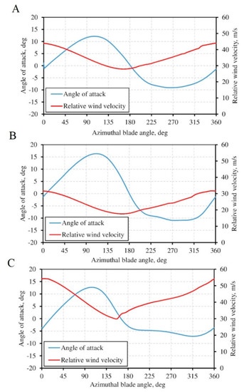Variation trends for the angle of attack and the relative wind velocity for the selected study cases.