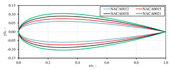 The study cases presented in Table 2 were used in particular to extract realistic trends of variation of the angle of attack and the relative air speed on the airfoils. These curves, presented in Figure 4, were obtained with the procedure described in [19] and slightly smoothed to purge them by unphysical discontinuities arising during the calculation of the induced velocity in areas of macro-vorticity, as discussed in the reference. The trends of Figure 4 were then used as an input for the sensitivity analysis on the GF effects. To this end, they were applied to four different uncambered airfoils of different thickness-to-chord ratios, namely the NACA0012, NACA0015, NACA0018, and NACA0021 (shown in Figure 5).