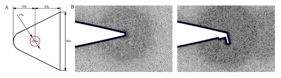 (A) Computational domain; (B) detailed view of the mesh at the trailing edge of the smooth airfoil (left) and near the GF (right).