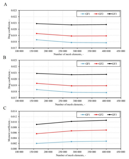 Mesh quality influence on (A) lift, (B) drag, and (C) moment coefficients.