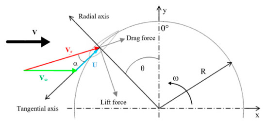 For the conventions used in the study, please refer to Figure 8. The overall torque T produced by the blade is given by Equation (2), where L and D are the lift and drag forces, respectively, and M it the moment around the blade-spoke connection point, which does not always correspond to the aerodynamic centre [23].