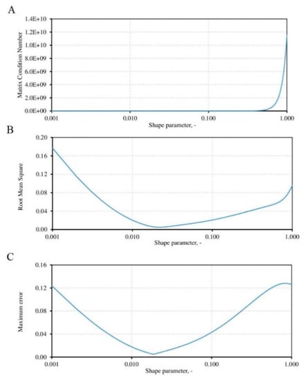 Shape parameter influence on: (A) matrix conditioning number, (B) root mean square (RMS) error, (C) maximum error.