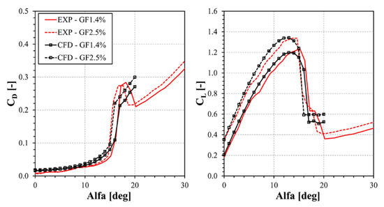 Comparison experimental results and CFD computations for static flow around airfoil equipped with GF at different values of angle of attack.