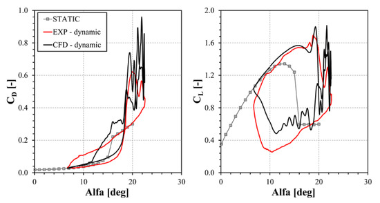 The test case was a NACA0021 airfoil under a Reynolds number of 180 k. The numerical model was tested both in terms of static polars and in dynamic pitching motion. For the sake of brevity, only the results with a one-sided GF (2.5%c) are reported here: Figure 10 displays the comparison of static polars and Figure 11 the performance in sinusoidal movement within an AoA range between 10 and 30 deg and a reduced frequency k of 0.05.
