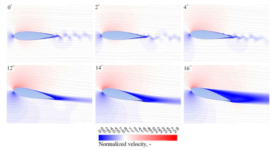 Normalized velocity contours for 0°, 2°, 4° and 12°, 14°, 16° angles of attack.