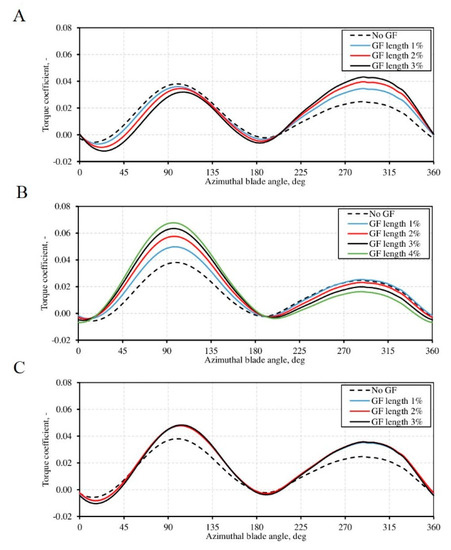 Increment of the torque value for optimal length of GFs for all investigated turbine configurations: (A) inward GF, (B) outward GF, (C) fish tail.