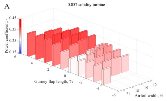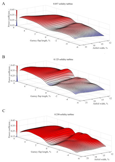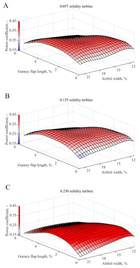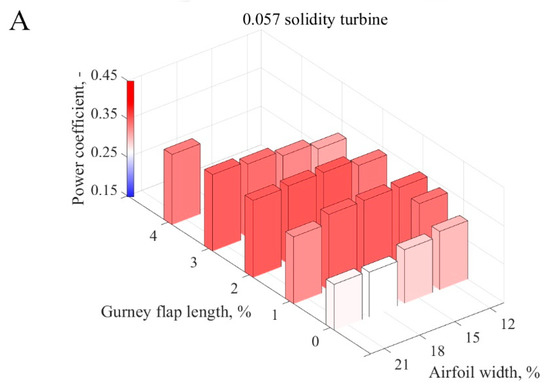 Optima were then found on the surfaces. Table 4 reports the values of the power coefficient for the configurations equipped with the most efficient blade and the reference blade, respectively. The power coefficient increment was defined as a ratio of the power coefficient of the blade with changed thickness and of the Gurney flap to the power coefficient of the reference blade.
