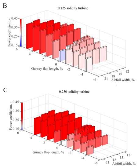 Numerical model results for one-sided Gurney flap for (A) 0.057, (B) 0.125, and (C) 0.25 equivalent solidity turbines.