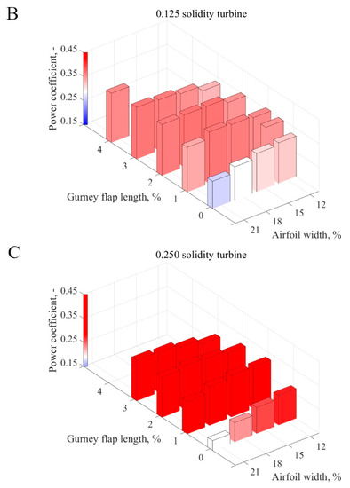 As discussed, the scope of the present analysis was to study the prospects of different GF configuration in terms of power augmentation of Darrieus VAWTs using symmetric airfoils. To this end, a large number of simulations were carried out. Figure 15A–C and Figure 16A–C show the results of all the studied cases in a way which allows the reader to have an overall outlook on the main effects. In further detail, the two figures show the influence of the one-sided Gurney flap (Figure 15) and the fish tail configuration (Figure 16), respectively, in terms of power coefficient variation for different airfoils thickness. Graphs A–C refer to the three different equivalent turbine solidities (increasing from A to C). The white color in the color palette indicates the reference value of the power coefficient with the smooth airfoil, the red color indicates an incremented one, and the blue color a decreased one.