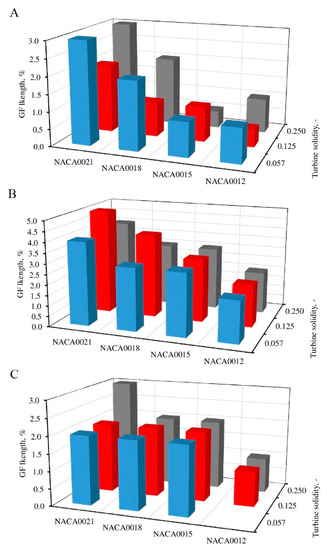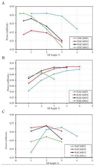 Optimal value of the GFs length for all investigated turbine configurations: (A) inward GF, (B) outward GF, (C) fish tail.