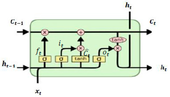 The traditional feedforward neural networks only accept information from input nodes. They do not “remember” input to different time series [31]. Thus, it cannot extract the hidden features which have a long-time dependency from raw data. LSTM is proposed for overcoming this shortcoming as its long-term memory character [16]. It is a kind of special recurrent neural network (RNN). It implements memory function through gate structure in one cell as shown in Figure 1. The key point of the LSTM cell is the upper horizontal line, and it works like a conveyor belt; the information will not change during the transmission. It deletes old information or adds new information through three gate structures: forgot gate, input gate, and out gate. The output value of three gates and updated information are expressed using , , , as shown in the following formulas: