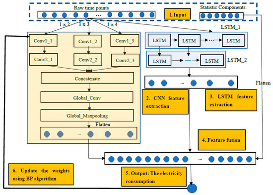 The limitations of current research for energy consumption forecasting are summarized as follows. On the one hand, most above methods only focused on one or two types of forecasts among VSTF, STF, MTF, and LTF. However, we need to master various types of future power consumption information to improve power supply efficiency and realize the smart grid. On the other hand, most existing methods refer to multi-variable regression, which requires collecting multiple related data. Motivated by this, we present a highly accurate deep model for various types of electricity forecasts by only using self-history data. We call this deep model multi-channels and scales CNN–LSTM (MCSCNN–LSTM). The proposed MCSCNN–LSTM employs dual channels as input to extract rich, robust feature representations from different domains of raw data. One channel is the raw sample, and the other is the information of statistics corresponding to the raw sample. We adopted the parallel structure of CNN–LSTM, which is different from conventional CNN–LSTM. At first, the CNN part in this structure extracts multi-scale and global features from the first channel using multi-scale and wide convolution technology. Then, the LSTM part guarantees to extract features that have a long-time dependency from the raw data. At last, combined with CNN, LSTM extracted features with statistics channels as comprehensive features to forecast the electricity consumption.