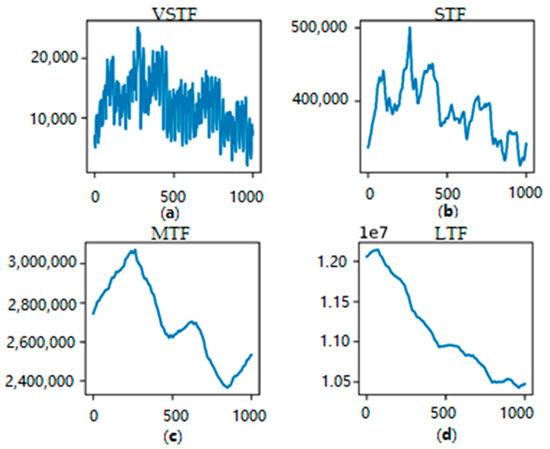 The original data is utilized to validate the effectiveness of VSTF. For the other forecasting tasks, we use an overlapping sample algorithm to generate corresponding samples for each forecast, as shown in Algorithm 1. The stride of the algorithm we defined is one. Notably, we adopted the sample rate of 24 h, 168 h, and 720 h to generate each type of sample for STF, MTF, and LTF. One electricity consumption at different durations is given in Figure 3, in which different types fluctuate differently, respectively, VSTF and STF, which fluctuate frequently.