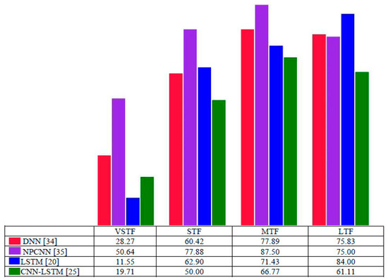 We compared our proposed deep model with other excellent deep models in Table 6, which indicates our proposed model is stable. Furthermore, Table 7, Table 8 and Table 9 and Figure 4 show that we have improved the performance compared to the stable DNN [34] and the best results of NPCNN [35], LSTM [20], and CNN–LSTM [25]. Primarily, it has improved a lot for STF, MTF, and LTF. Figure 5 explained that the proposed method could predict the detailed irregular patterns of electricity consumption.