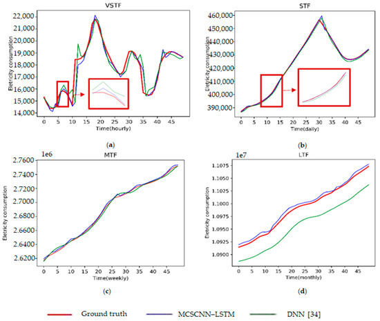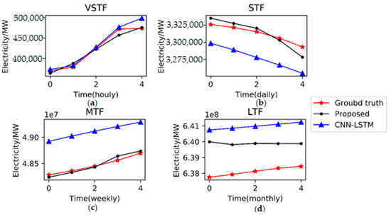 A comparison of the results of the five-step forecasting using the proposed method and CNN–LSTM [27]. The results indicate the proposed method has an absolute advantage in terms of STF, MTF, and LTF. For VSTF, CNN–LSTM performs a little better than proposed MCSCNN–LSTM. (a) Five-step electricity forecasting results for VSTF. (b) Five-step electricity forecasting results for STF. (c) Five-step electricity forecasting results for MTF. (d) Five-step electricity forecasting results for LTF.