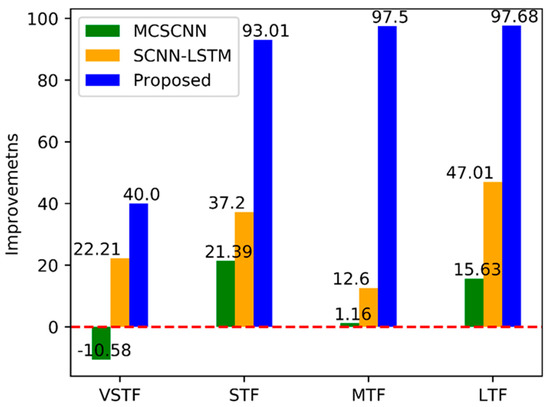 Comparing the MSCNN with the NPCNN [35], we find that the proposed MSCNN is more stable than general CNN-based methods. The results indicate MSCNN with single input cannot extract satisfactory feature representations for different forecasts of electricity consumption by comparing MSCNN with MCSCNN, especially for STF, MTF, and LTF. By comparing SCNN–LSTM to LSTM, we can see the MCSCNN can extract elegant, robust features to avoid instability and improve performance. We computed the averaged improvement of MAPE on three data sets for different duration forecasts, as shown in Figure 6. MSCNN is selected as the baseline. The findings reveal that the proposed method promotes a lot for all kinds of forecasts. Attentively, the results show only the performance of the MCSCNN on data AEP for VSTF decreased. Furthermore, the level of feature extraction capacity is ranked as proposed: > SCNN–LSTM > MCSCNN > MSCNN.