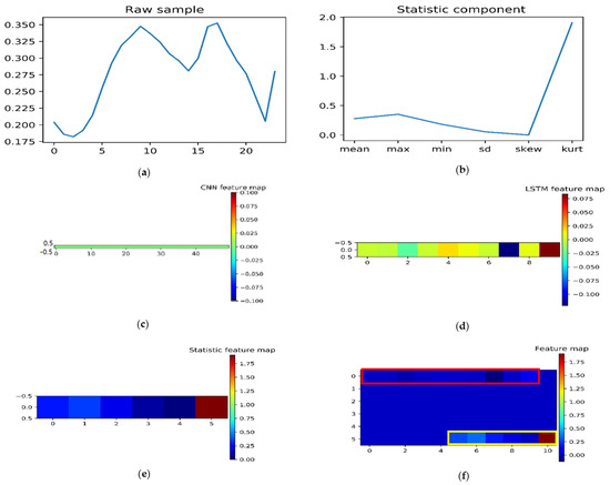 Secondly, we have analyzed the inside features to confirm the productive feature extraction capacity of the proposed deep model. The visualization results using one VSTF sample shown in Figure 7a,b intimate double-channel inputs: one raw data sample and corresponding statistics components by using the normalized data sample of AEP. Figure 7c is a CNN-learned feature map through the raw data sample. Figure 7d is the feature map of LSTM and we marked it with a red box at the comprehensive feature map Figure 7f, and Figure 7e is a statistic feature map that is marked with the yellow box in Figure 7f. The unmarked part in Figure 7f is a CNN-learned feature map. Figure 7f is a comprehensive feature map. The findings reveal that CNN can learn multi-scale robust global features with less noise because it almost has no changes around 0. The feature map of LSTM ranges from −0.100 to 0.075, and the statistic feature map ranges from 0.00 to 1.75, which indicates statistic components are more useful to extract detailed patterns than LSTM. The comprehensive feature maps combined robust multi-scale global features and detailed features of different domains.