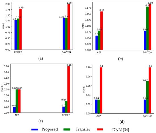 The DNN [34] and the proposed MCSCNN–LSTM applied the same data to train and test are considered as comparative experiments to validate the transfer learning capacity. For example, we trained DNN and MCSCNN–LSTM with the training part of COMED, DAYTON, and tested on the testing part of the same data set for VSTF. The results as shown in Figure 8; the x-axis is the testing part of each data set. The results indicate the proposed method has a functional transfer learning capacity, which outperforms DNN [34] for all kinds of forecasts, and a little lower than the proposed method using the same data to train and test the model. We performed a t-test to quantify this difference. The results of the p-value are shown in Table 12. If a p-value is higher than 0.05, it means there is no significant difference. The results show there was no significant difference when we utilized different companies’ data for training the model. Moreover, even though DNN [34] employed the same source data to train and test model, its performance is worse than “transfer”. Notably, there is a significant improvement for the VSTF of electricity consumption compared to DNN. In summary, Figure 8 and Table 12 confirmed that the proposed method has an excellent transfer learning capacity against noisy data.