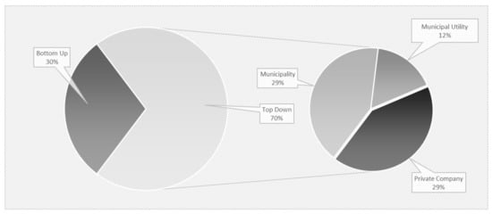 In Figure 2 we present the distribution of the initiatives between top down and bottom up approaches, i.e., showing to which extent the initiatives identified have been proposed and developed by citizens or other types of grassroot organizations (bottom up) or instead by an institution that defines the project and the form of citizens’ involvement. The majority of the initiatives have been proposed through a top down approach; of those, five have been proposed by a municipality and seven by a commercial actor (either a company or a municipal utility). Only five initiatives have been initiated with a bottom up approach by either a group of citizens or green associations (Figure 2).
