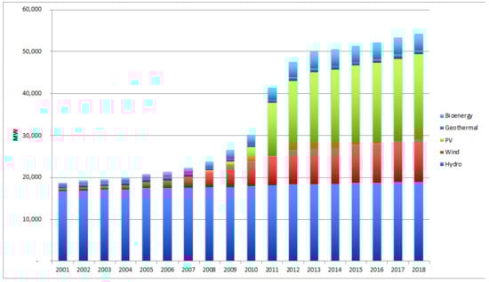 Renewable cumulative installed capacity in Italy (MW), 2001–2018 (data collected from reports by the Gestore dei Servizi Energetici (GSE)) [,,,,].