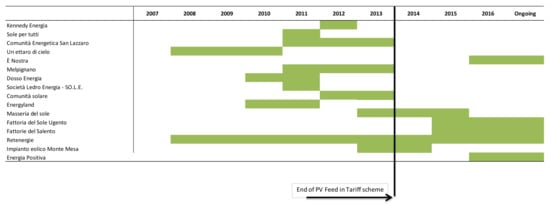 Between 2008 and 2013 PV technologies have been benefiting from generous and uncapped FiT schemes [] which have guaranteed fixed long-term tariffs and net-metering to PV system owners. Such strong policy support, combined with remarkable reductions in PV modules and installation costs since 2010 [,], has made PV investments quite profitable and relatively low risk in the wider context of the Italian energy sector. These favorable conditions have been a major driver for the development of Italian CE sector, opening a window of opportunity for the development of PV systems by proponents generally not equipped to deal with large, complex, and high-risk project development in the energy sector. Apart from one initiative providing electricity supply (È Nostra) and one dedicated to wind, electricity production from PV systems is in fact the primary activity across the whole sample (Table A2).