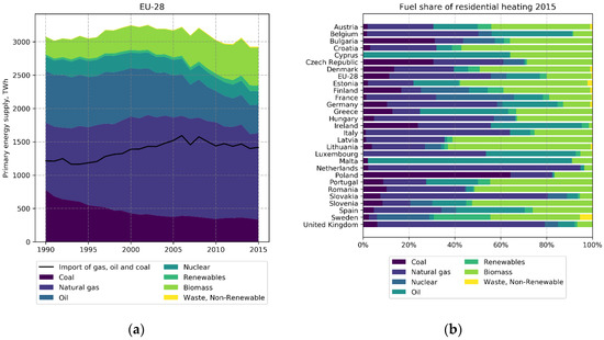(a) Development of primary energy supply for residential heating consumption from 1990 to 2015 in the EU-28 with the respective imports into the EU-28 of gas, oil and coal for residential heating. Results are climate adjusted. (b) Primary energy fuel share for residential heating in 2015 of the EU-28 member states.